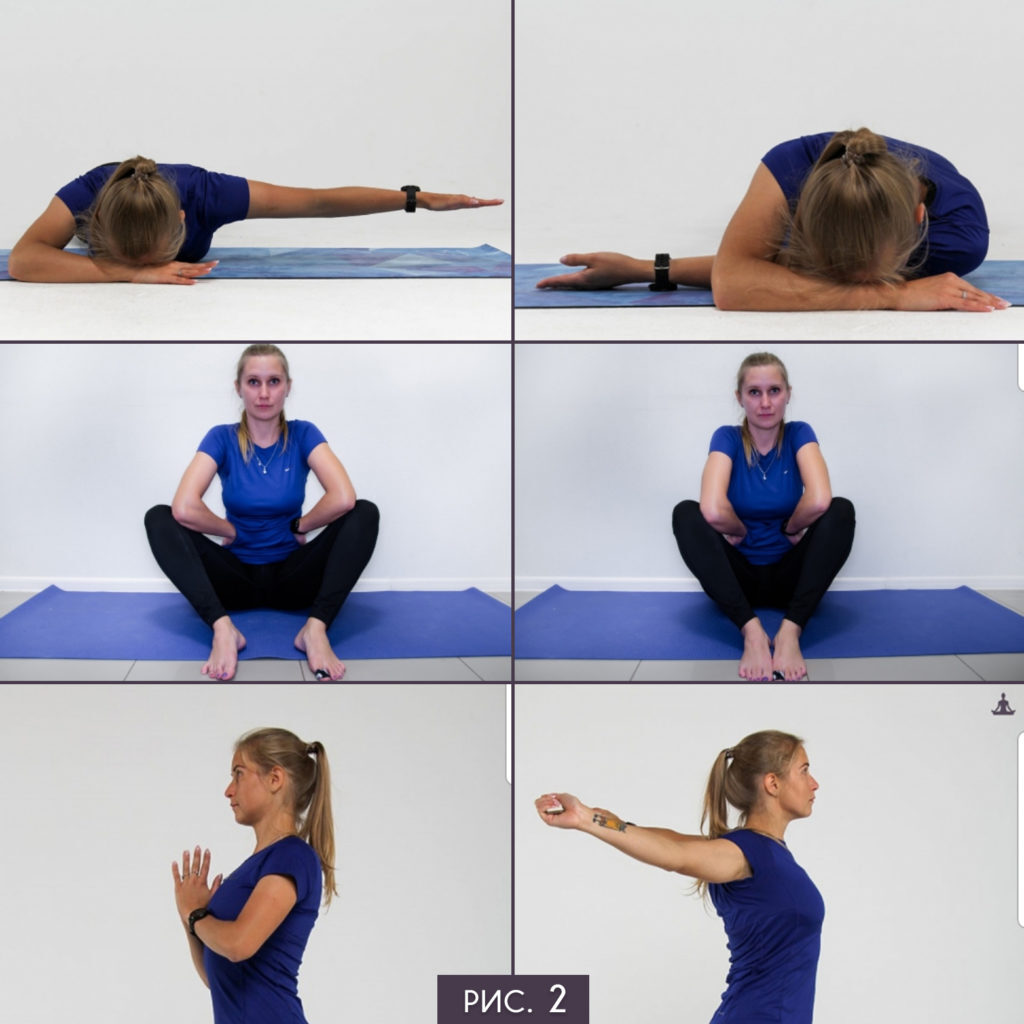 2. Воротниковая зона. Мягкая динамика будет отдельной статьёй в контексте подготовки к пранаяме, здесь дам короткий сет по расслаблению плечевой зоны и укреплению межлопаточных мышц.