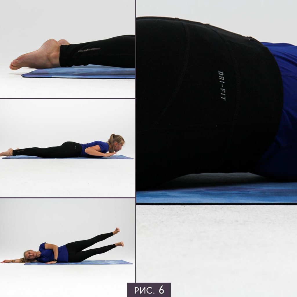 - Лодочка - к упражнению 6.1 добавьте приподнимание плеч над полом - лопатки к тазу, локти к бокам, ладони под плечи, нижние ребра продолжают упираться в пол.