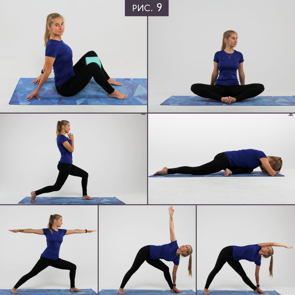 - Ягодичные мышцы: Выпад, 20 сек (напряжение) + Голубь на туже ногу, 40 сек (расслабление). 4 подхода на каждую ногу. Пункт 8 тоже входит в этот комплекс.
