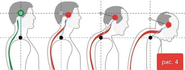 Если же осанка нарушена, а это происходит тогда, когда части тела хронически смещаются друг относительно друга неоптимальным образом, например, голова чрезмерно выдаётся вперёд или не подтянуты мышцы живота и он своим весом прогибает поясницу - мышцы начинают участвовать в удержании сегментов тела, находящихся не на своём месте. Как только это происходит, мышца повышает свой тонус, иногда сокращаясь (мышцы поясницы при гиперлордозе) иногда удлиняясь (мышцы шеи при наклоне головы вперед), но этот процесс всегда сопровождается напряжением мышечного волокна и искажением той информации, которая передается от мышцы в мозг (зажимаются датчики и вышележащее, обрабатывающее информацию с этих датчиков звено, из-за чего они дружно перестают нормально работать). Мышца становится жёсткой, сдавливает сосуды и кровообращение в ней ухудшается на всех уровнях.